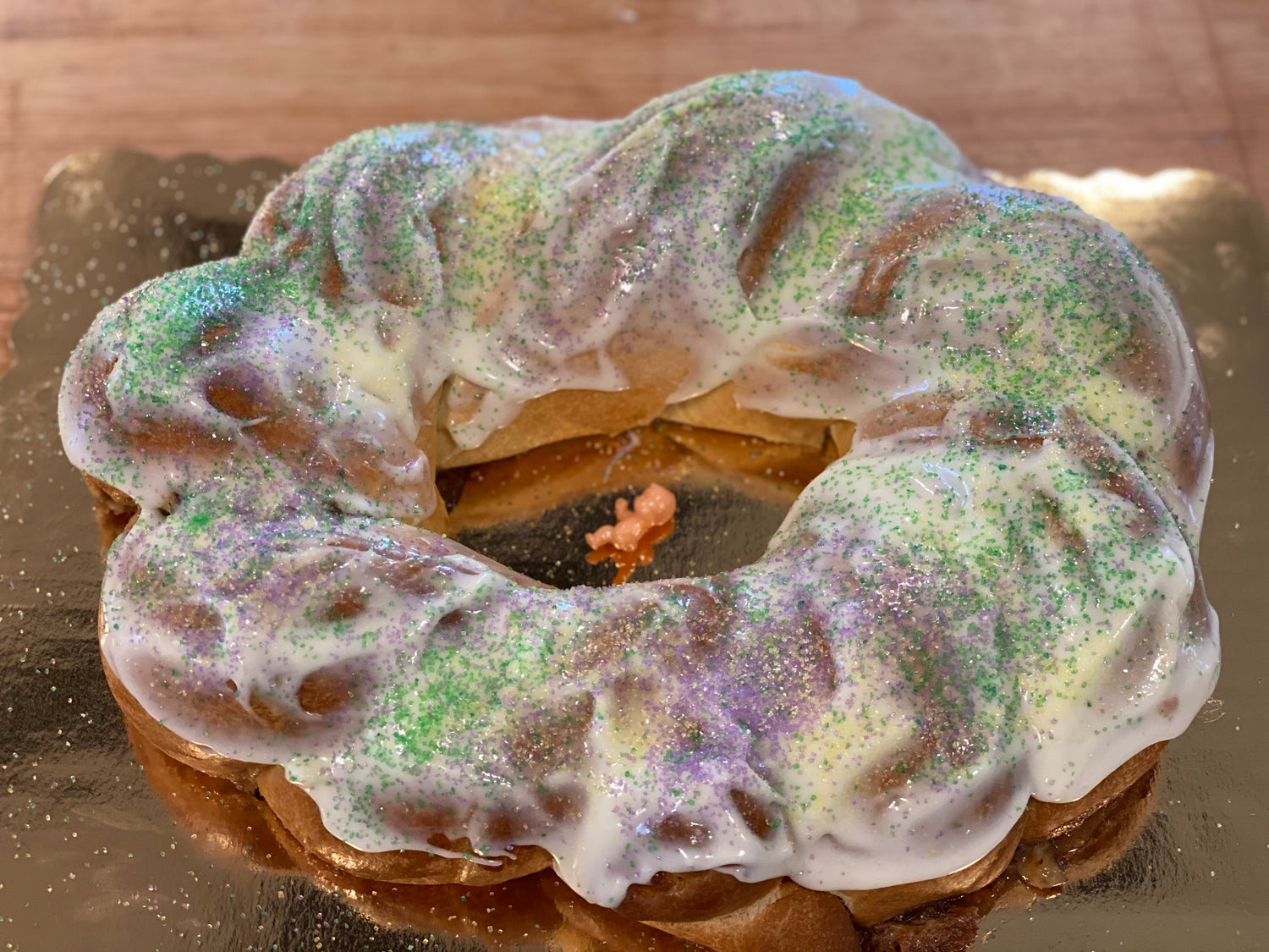 For aesthetic reasons, your king cake is shipped with the frosting and sprinkles on the side. Finishing instructions are included in the box.